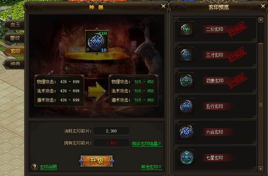 准神器玄印,全名玄龟印,一直沉睡在遗迹大陆,等待着主人的召唤。玩家通过参与活动,通关副本,收集足够的玄印碎片,可以在神器界面合成、升级【玄印】,从而极大提升自身的攻击力。
